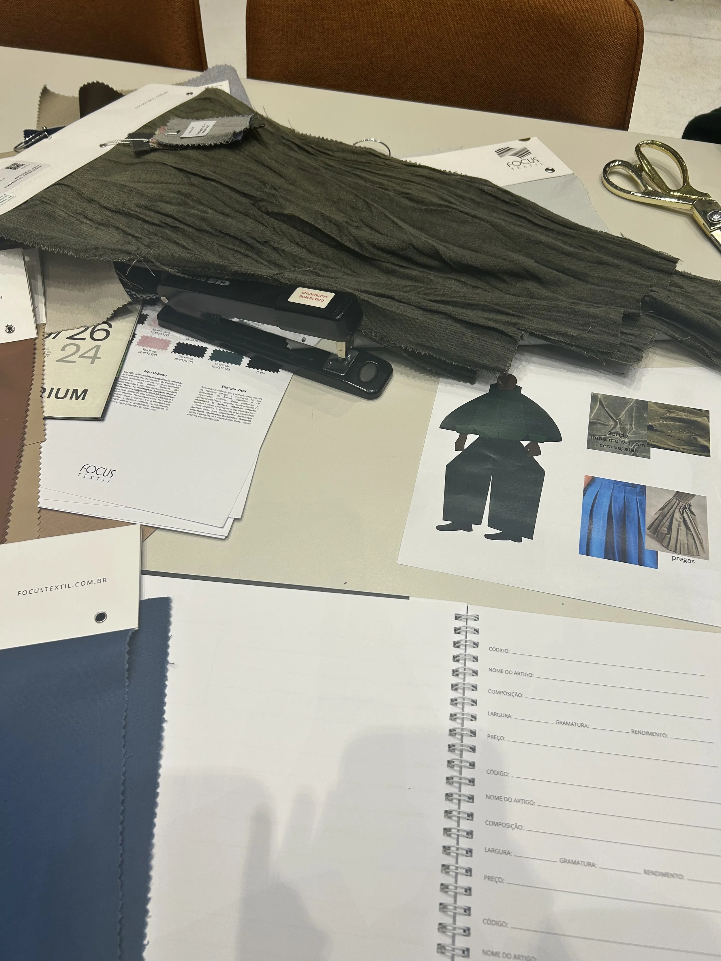 Sarja de algodão Canatiba, tactel com e sem elastano, couro de scoby, crochê e alfaiataria.